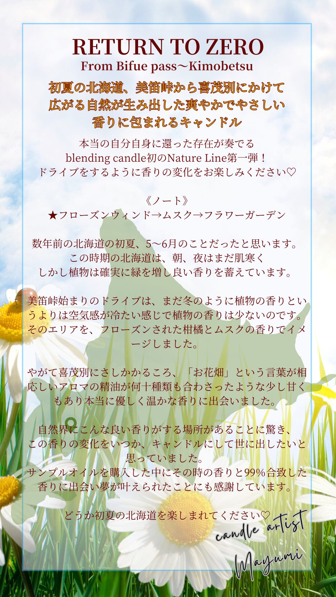 自然界にこんな良い香りがする場所があることに驚き、この香りの変化をいつかキャンドルにして世に出したいと思っていました。